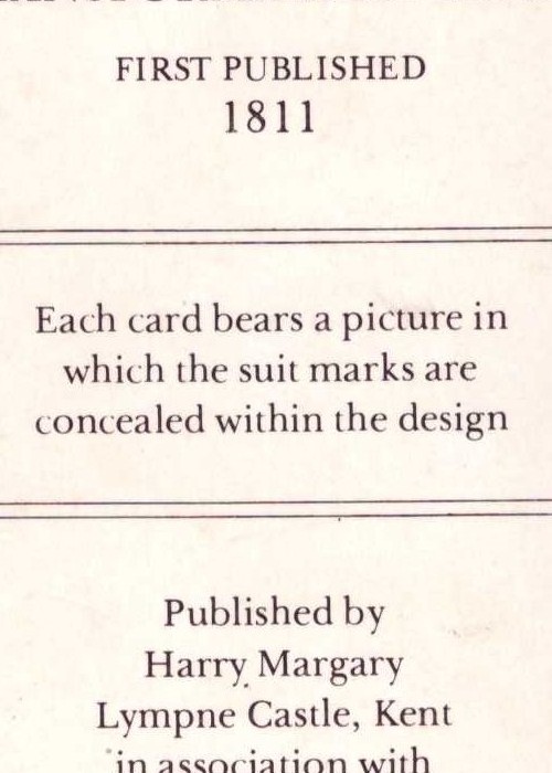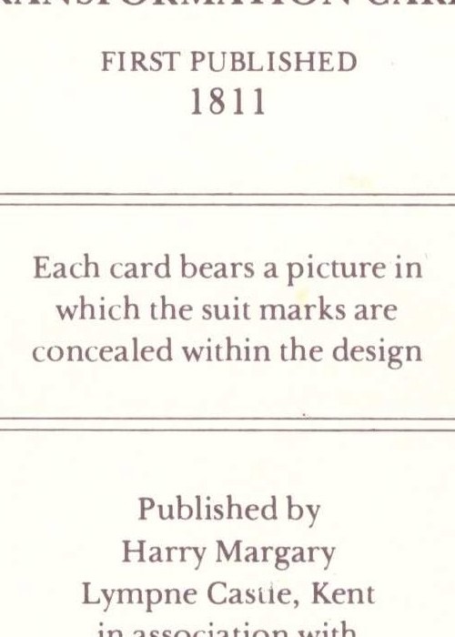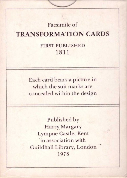 A 1978 reproduction by Harry Margary of the 1811 Metastasis – Transformation of Playing Cards deck. This facsimile is of the Nixon-Cowell-Jones variation of the original 1811 Metastasis deck and was estimated to be printed 1811 or possibly 1812 per Margary. However, recent appraisers and experts have placed the actual publication date as late as 1820. http://www.harrymargary.com/product_details.asp?id=15
