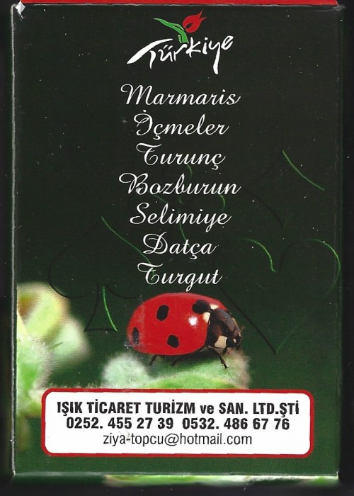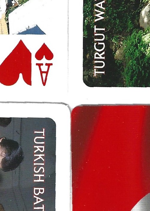 55 card deck, inc a card with the Turkish flag on and 2 jokers. Back design is a poor quality map. 52 colour photos of Turkey adorn the cards. Highly glossy and poor quality cards.