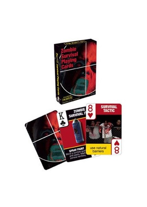 A Government Issue deck of cards with tips and valuable information to survive the zombie apocalypse. Each suit focuses on one of four categories: Survival Tactics and Tips (Hearts), Survival Weapons (Aces), Zombie Nature/Behavior (Diamonds), and Survival Tools and Items (Spades). Each card (including number cards) feature a unique photo and descriptive text related to the topic of the suit card. The joker cards have a photo and text which reads JOKER DON’T PANIC on the top and bottom of the cards.